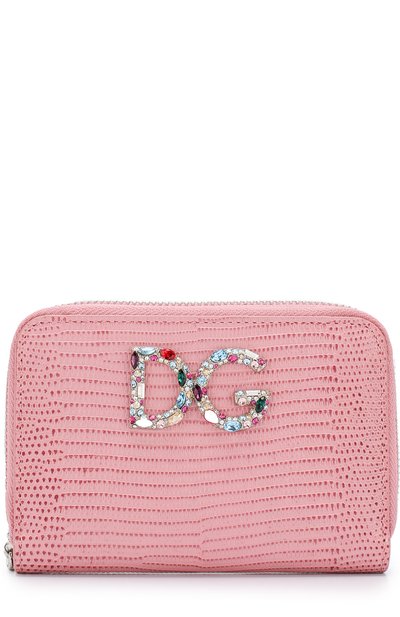 Нежно-розовый кошелек на молнии изготовлен из прочной фактурной кожи. Спереди аксессуар украшен логотипом бренда с разноцветными кристаллами. Внутри – отделение для купюр, карман для монет и три слота для карт.