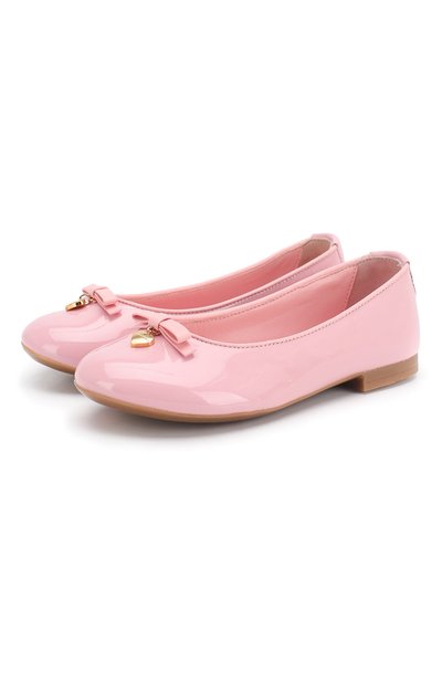 Светло-розовые балетки созданы из прочной лакированной кожи. Задник дополнен мягкими вставками изнутри, поэтому обувь не натирает кожу. Миниатюрный узкий бант на мысе декорирован золотистой подвеской в форме сердца (на ней выгравирован логотип бренда).