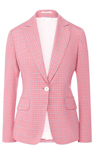 Розовый жакет в голубую клетку вошел в коллекцию сезона весна-лето. Изделие сшито из легкого кашемира, который мягче и нежнее обычной шерсти. Приталенная модель с прямоугольными лацканами застегивается на одну крупную пуговицу. Наши стилисты советуют сочетать с блузой светло-мятного оттенка, укороченными черными брюками и белыми туфлями на шпильке.