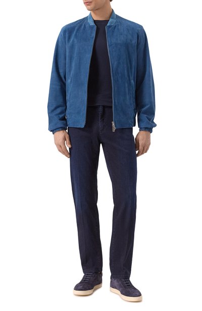 В весенне-летней коллекции бренда, основанного Пьетро Лоро Пьяна, бомбер получил новое звучание за счет материалов: модель кобальтового оттенка выполнена из бархатистой замши (для дополнительной мягкости кожу обработали по специальной технологии). Широкие манжеты, воротник-стойка и пояс изготовлены из приятного на ощупь прочного кашемира.