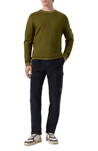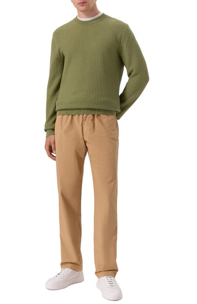 Для создания джемпера использовали хлопковый трикотаж. Манжеты, пояс и круглый вырез выполнили в рубчик.