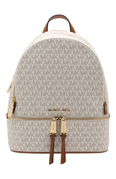Майкл Корс включил в классическую коллекцию рюкзак Rhea молочного оттенка (в марке его назвали Vanilla). Для его пошива дизайнер выбрал плотный материал, который умело притворяется зернистой кожей. Глянцевое покрытие не только защищает от влаги и грязи, но и создает акцент на сером паттерне. Внутрь поместятся планшет и кошелек, а во внешнее отделение – смартфон и зеркало.