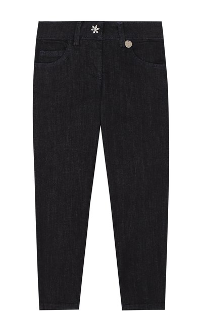 Джинсы с заниженной посадкой произведены из мягкого прочного хлопка. Тонкий материал содержит волокна эластана, поэтому зауженное изделие не сковывает движения. Универсальная темно-синяя модель украшена лаконичным цветком из прозрачных стразов. Еще один декор — круглый металлический патч с гравировкой в виде логотипа марки.