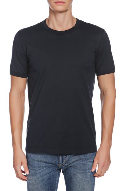 При создании темно-синей футболки Доменико Дольче и Стефано Габбане удалось умерить свою любовь к ярким принтам: единственный декор – небольшая темная накладка с логотипом бренда на передней полочке. Модель с короткими рукавами и V-образным вырезом сшита из мягкого хлопкового джерси. Лаконичное изделие гармонично впишется в образ в стиле спорт-шик.
