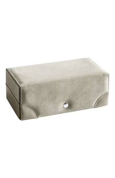 Серую шкатулку обтянули мягкой замшей, которую обработали так, чтобы она на ощупь напоминала кашемир. За счет тонкой выделки материал очень нежный, поэтому края дополнительно укрепили прочной кожей. Внутреннее отделение со множеством отсеков обили бархатистой тканью, чтобы вещи внутри не поцарапались.