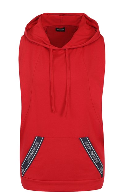 Топ с широкими проймами выполнен из тонкого хлопкового джерси. Материал хорошо тянется, не сковывая движений, поэтому в такой вещи будет комфортно. Изделие с карманом-кенгуру дополнено объемным регулируемым капюшоном.