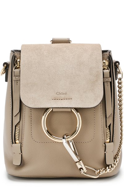 Знаковым для рюкзаков линии Faye стали металлическое кольцо, цепь с карабином и регулирующие объем боковые молнии. Эта светло-серая модель — не исключение. Небольшое изделие сшили из зернистой кожи с анилиновым покрытием (такая обработка делает материал прочным и подчеркивает фактуру), широкий клапан — из замши с водоотталкивающей пропиткой: так она меньше пачкается.