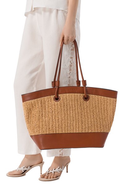 Плетеная сумка Basket словно создана, чтобы наслаждаться морским бризом, но эта будет уместно смотреться и в городе. Мастера марки, основанной Энрике Лоэве, изготовили модель вручную из прочных пальмовых листьев натурального бежевого тона. Накладку на передней панели, как и две регулируемые ручки, выполнили из коричневой кожи. Внутрь поместятся кошелек, любимый аромат и солнечные очки.