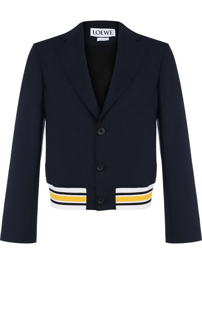 В весенне-летнюю коллекцию бренда, основанного Энрике Лоэве, вошел темно-синий бомбер, стилизованный под однобортный пиджак с широкими лацканами. Для изготовления модели Джонатан Андерсон выбрал тонкий легкий мохер (пряжу создают из особенно прочной шерсти ангорских коз). Шелковистый на ощупь материал не мнется, поэтому такая вещь не требует сложного ухода.