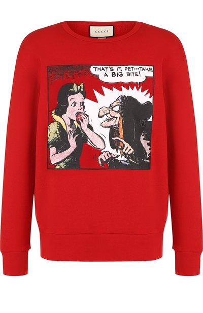 В весенне-летней коллекции Алессандро Микеле украсил несколько вещей изображениями Белоснежки, нарисованной студией Уолта Диснея в конце 1930-х. Ярко-красный свитшот с таким принтом сшит из тонкого мягкого хлопка джерси. На спинке — черная надпись в виде фамилии Гуччио Гуччи.
