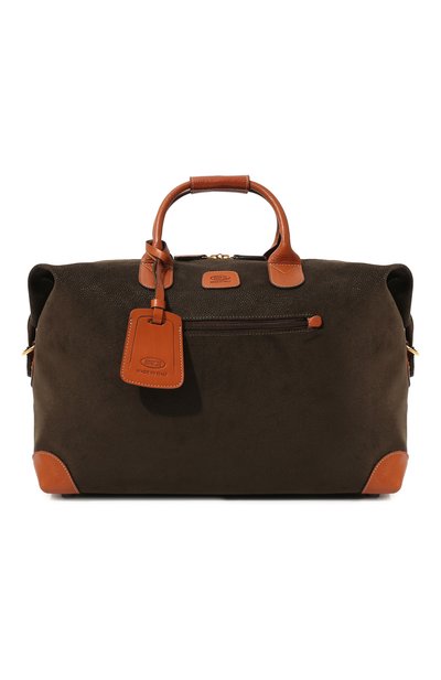 Эта компактная дорожная сумка подойдет тем, кто предпочитает путешествовать налегке. Небольшой размер позволит взять модель в салон самолета, съемный плечевой ремень освободит руки в аэропорту, а в наружный карман поместятся билеты и паспорт. Аксессуар выполнен из тонкой и одновременно прочной экозамши, поэтому весит всего один килограмм. С материалом цвета еловой хвои контрастируют ручки, накладки и багажная бирка из коричневой кожи.