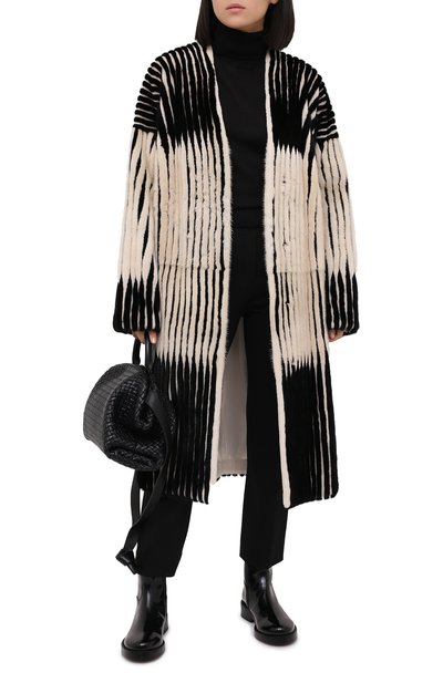 В осенне-зимней коллекции Пьерпаоло Пиччоли обратился к архивам марки. Например, прямое белое пальто украшено расшитым сверкающими пайетками мотивом Wave (впервые рисунок появился в 1970-х). Мастера бренда, основанного Валентино Гаравани, выполнили модель из фактурной овчины. Приятный на ощупь мех хорошо сохраняет тепло, поэтому в такой вещи будет комфортно в прохладную погоду.