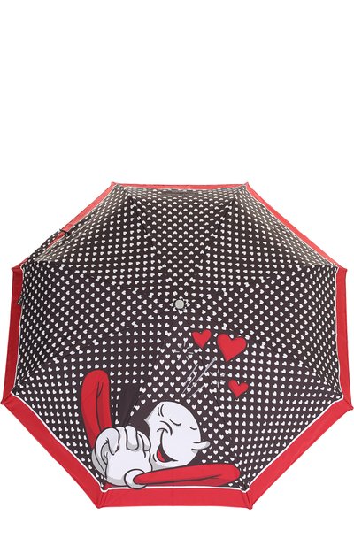 Черный складной зонт изготовлен из гладкого полиэстера. Этот прочный материал не пропускает воду. Модель украшена широким красным кантом и принтом в виде миниатюрных сердец и мультяшной девочки. Изделие дополнено небольшой ручкой.