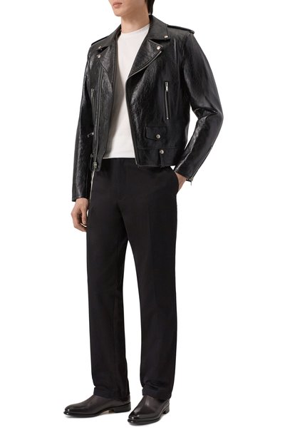 Для изготовления черной косухи из осенне-зимней коллекции Алессандро Микеле выбрал фактурную кожу с приглушенным блеском и искусственно созданными заломами. Длинные рукава и плечи украшены стеганым узором. По бокам – белые вставки с синей полосой Web и фамилией Гуччио Гуччи, стилизованной под эмблему компании Sega.
