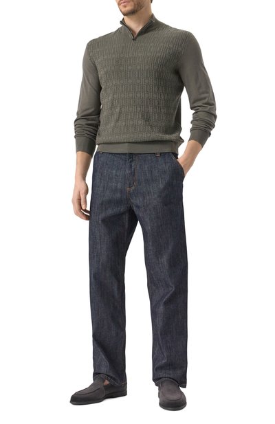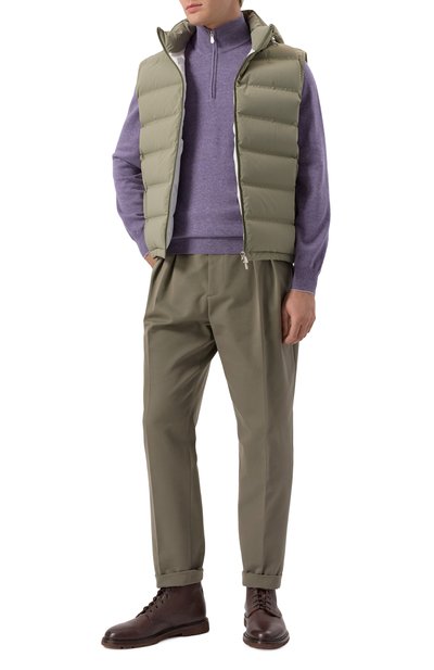 Меланжевый джемпер изгото вили из кашемирового трикотажа. Эластичные пояс, манжеты с каймой и высокий воротник выполнили в рубчик. Изделие застегивается короткой молнией с брендированным пуллером.