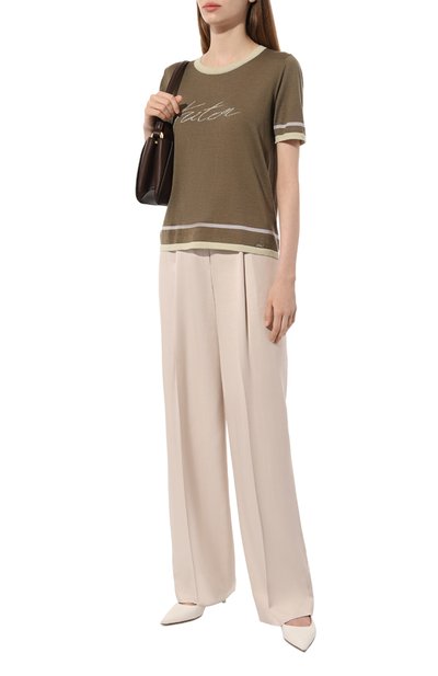 Футболку цвета хаки мастера бренда, основанного Брунелло Кучинелли, изготовили на собственной мануфактуре марки в Соломео. Для создания модели с круглым вырезом использовали исключительно нежный трикотаж Sparkling из кашемира и шелка. В состав нежного материала, который приятно ощущается на коже, включили волокна ламе, п ридающие полотну деликатное сияние.