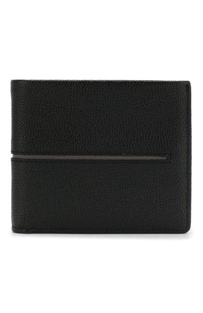 Черное портмоне, изготовленное мастерами марки вручную из зернистой матовой кожи, украшено узкой серой полосой. Внутри компактного аксессуара — два отделения для банкнот, восемь слотов для кредитных карт и отсеки для чеков.