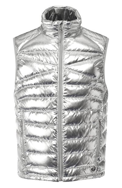Ральф Лорен сделал металлизированные ткани одним из главных спецэффектов весенне-летней коллекции. Например, для создания этого стеганого жилета дизайнер выбрал тонкий серебристый нейлон. А благодаря утиному пуху и перу с индексом fill power 700 изделие получилось не только теплым, но и очень легким. Модель с высоким воротником-стойкой застегивается молнией.