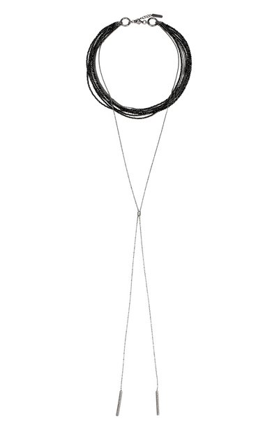 Объемное колье состоит из нескольких нитей, унизанных бусинами из черной непрозрачной шпинели с бриллиантовой огранкой, и знаковых для бренда цепочек Мониль. Самая длинная из них с двумя подвесками фиксируется небольшим кубом. Этот аксессуар отлично дополняет декольте вечернего платья и хорошо смотрится с распущенными волосами.