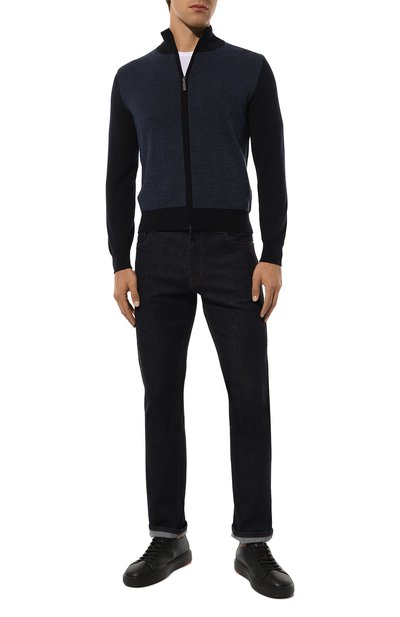 Темно-коричневый кардиган получился тонким, но при этом он справляется со своей главной задачей — поддерживать комфортный микроклимат. За сохранение тепла отвечает мягкий, при этом плотный шерстяной трикотаж. Основной материал с меланжевым узором оттенили однотонными манжетами, поясом, воротом, как у водолазки, и узкими планками, очерчивающими встречную молнию.