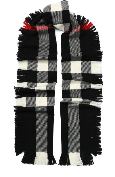 Широкий черно-белый шарф будет одинаково хорошо смотреться и с пальто, и с кожаной курткой. Для изготовления аксессуара мастера марки использовали мягкую шотландскую шерсть. Модель декорирована короткой густой бахромой и крупным клетчатым узором. Длины изделия хватит, чтобы завязать французский узел.