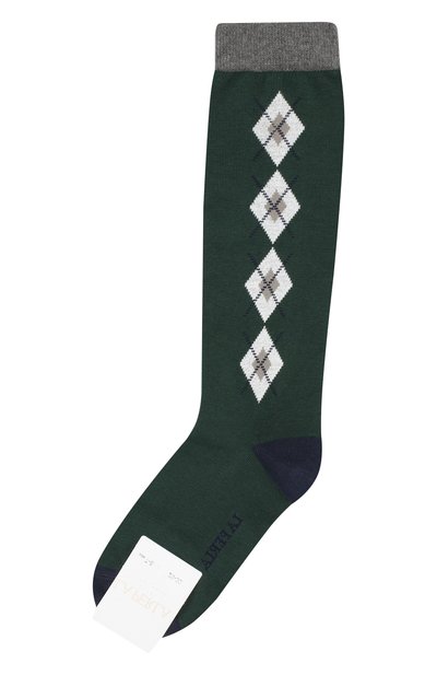 Мастера бренда выполнили темно-зеленые гольфы из мягкого трикотажа на основе хлопка. Эластичные волокна в составе материала придают изделию особую прочность и обеспечивают его идеальную посадку по ноге. В качестве декора использован разноцветный орнамент аргайл и надпись в виде логотипа марки.