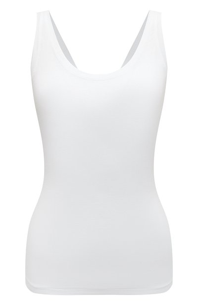 Однотонный белый топ из гладкого шелковистого модала стрейч хорошо пропускает воздух, не пилингуется и не растягивается со временем. Облегающая лаконичная модель с круглым вырезом и плоскими незаметными швами настолько легкая и мягкая, что почти не ощущается на теле.