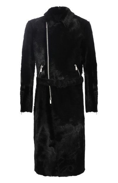 Джорджио Армани сшил это пальто по лекалам классической косухи: об этом напоминают диагональная молния до пояса и характерный воротник. Для изготовления модели из осенне-зимней коллекции дизайнер выбрал мягкую шкуру теленка с густым глянцевым мехом. В комплекте – широкий съемный пояс из такого же материала.
