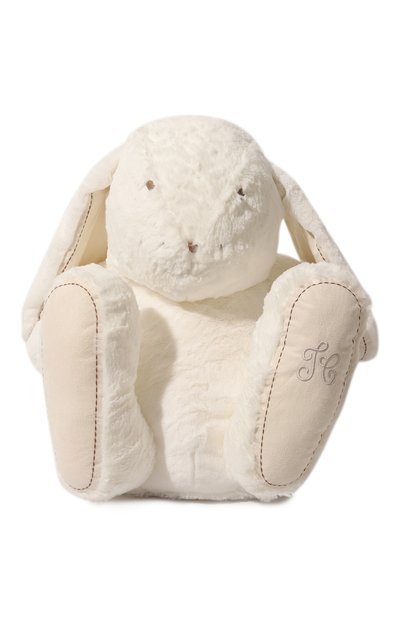 Мастера марки изготовили большого молочно-белого кролика Augustin из густого нежного эко-меха, поэтому он получился особенно приятным на ощупь. Текстильные вставки на лапах и ушах, напоминающие замшевые, украшены контрастной коричневой строчкой в тон глаз и носа.
