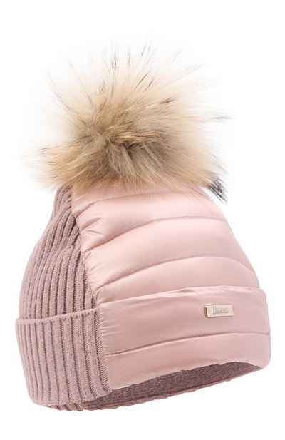 Пастельно-розовая шапка с широким отворотом защитит голову от холода и ветра. Для создания модели мастера марки использовали мягкую тонкую пряжу с волокнами кашемира, а половину утеплили стеганой пуховой накладкой из непродуваемого нейлона. Из декора у изделия лишь объемный помпон из пушистого бежевого меха.