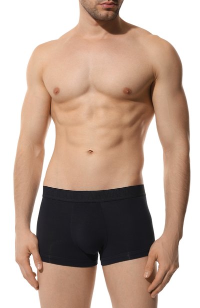 Удлиненные темно-синие боксеры комфортно облегают, не сдавливая кожу. Для изготовления трусов мастера марки использовали плотный хлопок, который получился эластичным благодаря особому переплетению. Широкий плоский пояс украсили брендированным узором в тон.
