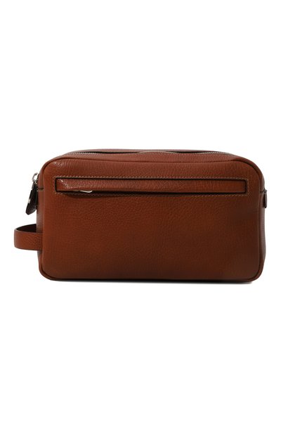 В весенне-летнюю коллекцию 2019 года Брунелло Кучинелли включил коричневый несессер. Модель выполнена из прочной зерненой кожи (специальная обработка подчеркивает фактуру материала). Основное отделение с подкладкой из непромокаемого текстиля дополнено накладным карманом. Аксессуар закрывается широким клапаном на две молнии и магнитный замок. На боковой панели – короткая ручка.