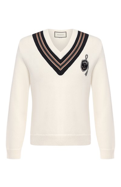 Белый пуловер вошел в весенне-летнюю коллекцию. Мастера марки выполнили модель из тонкой мягкой шерсти. Такой материал хорошо держит форму и практически не мнется. Изделие с V-образным вырезом, подчеркнутым широким контрастным кантом, украшено нашивкой в виде герба с якорем.