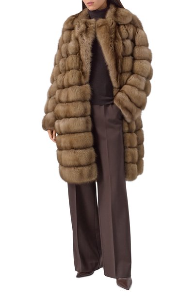 Это пальто достаточно нейтрально, чтобы подружиться как со сдержанными, так и с яркими вещами, но при этом не лишено индивидуальности. Все дело в прямом крое и спокойных бежевых оттенках, будто позаимствованных у латте. Мастера марки, основанной Пьетро Лоро Пьяна, сшили модель из густого шелковистого меха норки.
