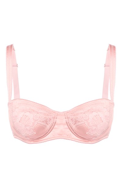 Для создания бюстгальтера-балконета цвета клубничного зефира использовали гладкий шелковый атлас с добавлением эластичных волокон. Плотные чашечки на косточках отвечают за оптимальную поддержку груди, а широкие регулируемые бретели обеспечивают удобную посадку, не впиваясь в кожу. Модель декорировали ажурным хлопковым кружевом с цветочным мотивом.
