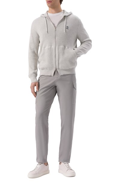 Кремовому однотонному кардигану дизайнеры бренда придали спортивное звучание, позаимствовав крой и глубокий регулируемый капюшон у толстовки. Для изготовления модели со встречной молнией использовали мягкий тонкий кашемир из отборного пуха горных коз. Лаконичное изделие почти не ощущается на теле и обеспечивает оптимальную терморегуляцию.
