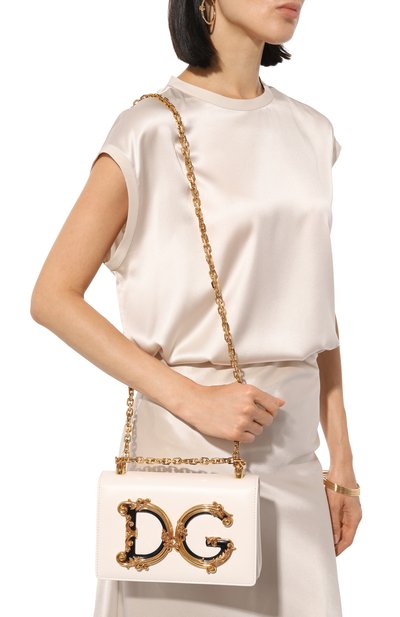 В сезоне весна-лето 2020 года Доменико Дольче и Стефано Габбана дополнили цветовую палитру сумки DG Girls пудровой моделью. Такой оттенок стал идеальным фоном для крупной DG-монограммы с золотистой отделкой в стиле барокко, выполненной в ювелирной технике. Для изготовления аксессуара со скользящим ремнем-цепочкой использовали гладкую матовую кожу.