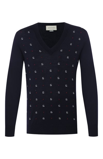 В сезоне весна-лето Алессандро Микеле обратился к архивам марки: например, передняя полочка этого синего пуловера украшена миниатюрным жаккардовым узором Square G (впервые паттерн появился на вещах бренда, основанного Гуччио Гуччи, в 1970-х). Модель с V-образным вырезом выполнена из тонкой, шерстяной пряжи.