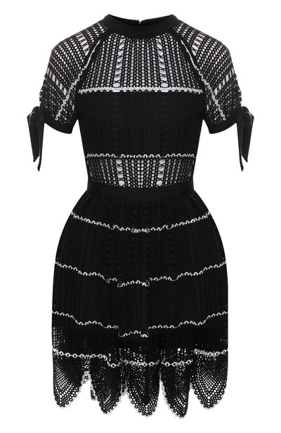 Кроше – более уютный, но не менее эффектный аналог кружева. Из этого тонкого материала выполнили и черное приталенное платье (чтобы сделать вещь романтичнее, короткие рукава дополнили объемными бантами). Изделие вошло в весенне-летнюю коллекцию.