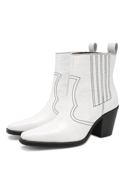 Белые казаки вошли в весенне-летнюю коллекцию. Мастера марки изготовили модель из плотной кожи с тиснением под крокодила. Характерный для такой обуви рисунок подчеркивает тонкая черная строчка, которая гармонирует с подошвой и скошенным каблуком.