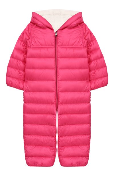 В стеганом комбинезоне цвета фуксии будет комфортно благодаря наполнителю из гусиного пуха и пера. Он почти ничего не весит и быстро принимает первоначальную форму после сжатия, а образующаяся воздушная прослойка удерживает тепло тела внутри. Модель на длинной молнии выполнили из тонкого нейлона, защищающего в равной мере и от ветра, и от влаги.