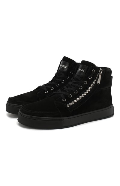 Оливье Рустен включил высокие черные кеды в коллекцию сезона весна-лето. Мастера марки, основанной Пьером Бальманом, выполнили изделие из мягкой фактурной замши. Модель на шнуровке дополнена двумя серебристыми молниями.