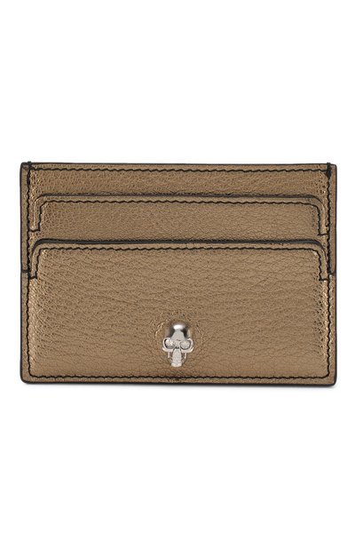 Для производства золотистого кардхолдера мастера марки использовали зернистую металлизированную кожу. Модель украшена знаковым для бренда черепом, инкрустированным прозрачными кристаллами Swarovski. Футляр с четырьмя слотами для кредитных карт дополнен открытым отсеком для чеков.