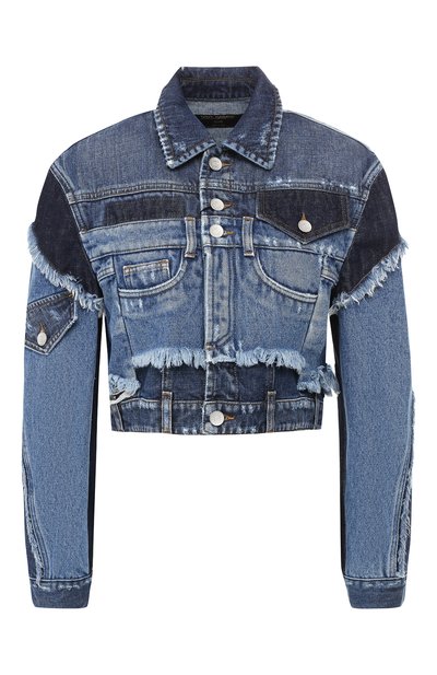 В сезоне весна-лето Доменико Дольче и Стефано Габбана вывели джинсовую куртку на новый уровень, переведя ее из повседневной одежды в разряд must-have. Например, эта укороченная модель выглядит, словно ее собрали из деталей нескольких вещей. Изделие выполнили из мягкого прочного денима разных оттенков синего и декорировали густой бахромой.