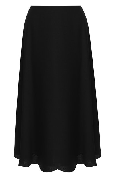 При всей строгости черного цвета эта юбка выглядит расслабленно. Правильно настроение здесь задает расклешенный крой и длина — до середины икры. Для пошива модели из коллекции сезона весна-лето использовали фактурный текстиль: вискоза в его составе отвечает за сохранение оттенка, а волокна эластана сделали ткань прочнее. Изделие с классической посадкой застегивается сбоку на потайную молнию.