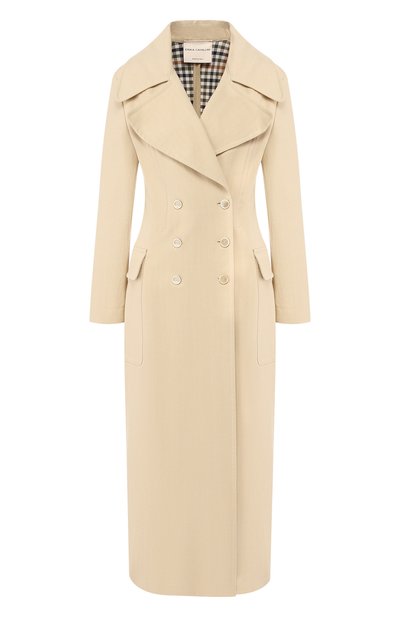 Приталенное бежевое пальто из весенне-летней коллекции – идеальный вариант для прохладной погоды. Для создания двубортной модели с широкими лацканами Эрика Каваллини выбрала плотный хлопок. Такой материал хорошо держит форму и не пилингуется, поэтому вещь не требует особенного ухода.