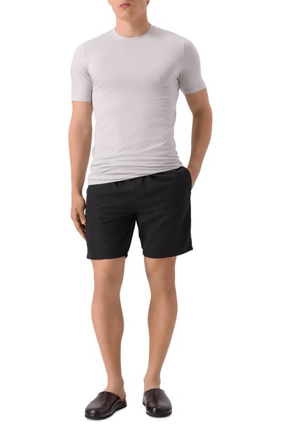 Футболку сшили из джерси, которое произвели из выращенного на острове Барбадос хлопка Sea Island. Модель с круглой горловиной в рубчик можно носить сольно или использовать как промежуточный слой.
