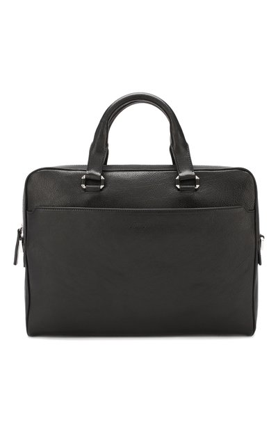 Черная сумка для ноутбука, с короткими ручками и съемным плечевым ремнем сшита из прочной тисненой кожи с матовым блеском. Основное отделение застегивается на молнию. На плоском внешнем кармане — логотип марки. Аксессуар вошел в коллекцию сезона весна-лето.