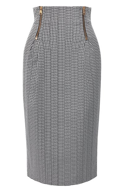В весенне-летнюю коллекцию Донателла Версаче включила юбку-карандаш с завышенной линией талии. Модель сшита из мягкой ткани с черно-белым узором пье-де-пуль. Сзади – молния по всей длине, придающая лаконичному изделию немного дерзости. Рекомендуем сочетать с кроп-топом из такой же ткани.