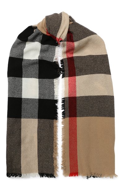 Бежевый шарф в клетку выполнен из тонкой шерсти с добавлением кашемира. Для придания изделию особой мягкости и блеска материал вымачивают в ключевой воде, а затем проглаживают и отпаривают. Аксессуар украшен короткой бахромой.